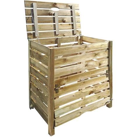 Ce bac à compost est très complet avec son couvercle, que vous pouvez maintenir ouvert à l’aide d’une cale en bois, et sa trappe en façade qui se soulève et que vous pourrez bloquer avec ses loquets en bois.