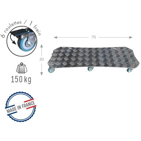 Ce roule plante Bac en aluminium d’une longueur de 70 cm et d’une largeur de 30 cm dispose de 6 roulettes dont une avec un frein, il vous permettra de déplacer facilement vos bacs les plus lourds. En effet, il peut supporter jusqu’à 150 kg. Conçu pour l’extérieur et l’intérieur. Fabrication française. Résistant au gel et UV. Veillez à répartir le poids uniformément sur le roule plante.