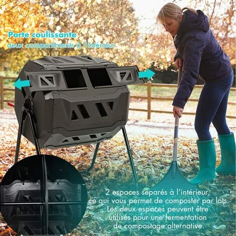 - ★CONCEPTION UNIQUE DE RETOURNEMENT★ Le seau à compost tourne librement à 360º, vous empêchant de remuer avec vos mains et d’autres outils. Vous n’avez pas besoins à travailler dur pour faire un compostage efficace. Il suffit de fermer la porte du seau à composter et de le retourner tous les 2-3 jours pour obtenir facilement l’engrais.