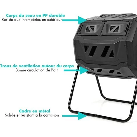 - ★EXCELLENT SYSTÈME DE VENTILATION★ Les trous de ventilation autour du corps, ce qui permettent une bonne circulation de l’air. Ils fournissent suffisamment d’oxygène pour le processus de fermentation tout en évitant une accumulation excessive de gaz de fermentation. Cela garantit l’exécution efficace du compostage aérobie et garantit également une sécurité suffisante.