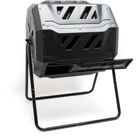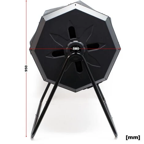 La capacité du réservoir en plastique est de 160 litres . Il est surélevé sur un support noir en revêtement d’acier. La cuve du composteur est ainsi suspendue librement et peut tourner sans difficultés. Les rotations mélangent régulièrement les matières à composter et fournissent suffisamment d’oxygène. Le fait de tourner à intervalles réguliers accélère le compostage, le mieux serait de le faire après chaque remplissage 5 à 10 fois tous les 2 à 3 jours.